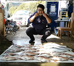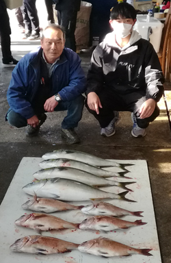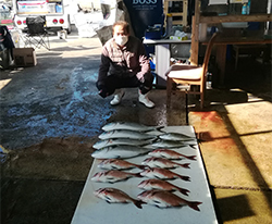 三重県伊賀市の広瀬さんらがマダイとワラサを台いっぱいにゲット!見事な腕前です! |